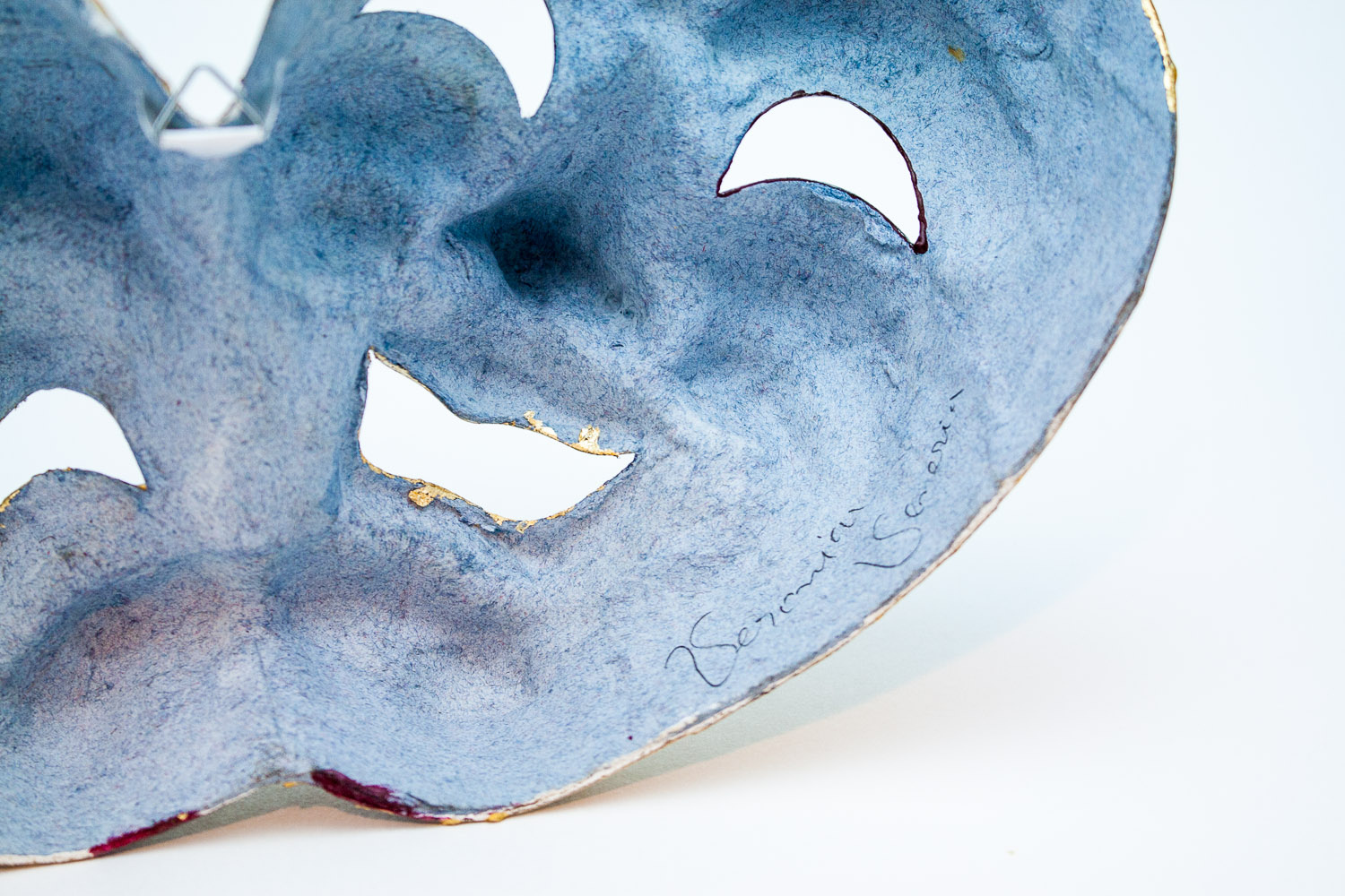 The iconic tragedy and comedy face create here a unique masterpiece worth hanging on your wall. Inserts of musical paper from Florence contrast the antique red covering part of the faces. The golden contorted decoration adds a layer of texture giving this mask an elegant composition. This classic color combination reminds us of the Venetian flag.